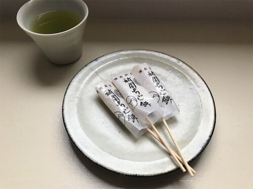 三條若狭屋の名物、ちご餅。白味噌を甘く炊いたものを求肥で包み、氷餅をまぶし竹串にさし、三本を1包みした祇園祭に伝わるお菓子です。 三條若狭屋 パッケージ 祇園ちご餅のパッケージは、写真の様な形。三角形にちご餅の短冊がついており、ユニークな包装…