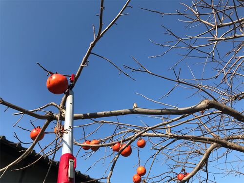 渋柿を木で熟させる。ある程度熟してきたら、収穫。 高枝バサミで収穫はとても楽しい作業。 枝を整え、ヘタを取り、皮を剥いて、吊るす。 太陽も風が柿を甘く干してくれる。素晴らしい気候の恵。