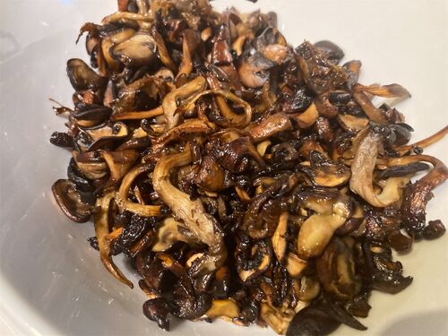 きのこのカリカリ焼き。きのこの種類は、アンズタケ、ヒラタケ、マッシュルーム、ハナビラタケ。フライパンにかけて、ほっておくだけでできるので簡単。