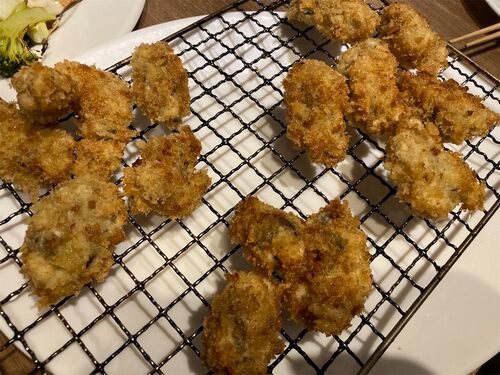 Royal miyagiとnight pearlとkusshi の3種類の牡蠣。 カキフライにすると、味の違いが分かりにくい。しかし、手で剥いたすぐのカキフライはやはり美味しい。
